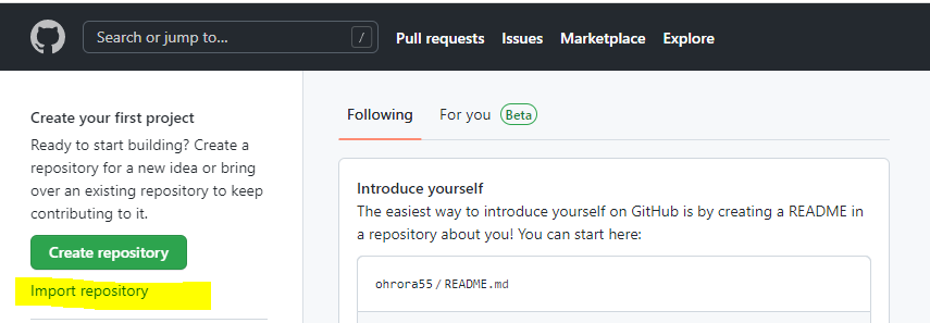 3. 신규 저장소로 로그인을 한 후, import repository 생성
