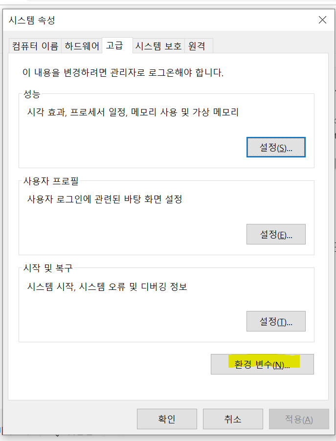 시스템 환경 변수에 들어가서 Java 환경 변수가 잘 설정되어있는지 확인해보면 된다.